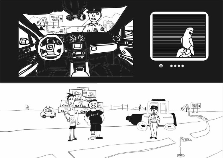 - Caption|Adapted from “Theoretically, An Impact". In this graphic work I chose to start with a scene, the top left is the view from inside the car, where an expressionless policeman stands on duty; the top right is the parrot that survived the gun battle; the bottom part of the work, which also takes up most of the space, shows the policeman and the two fugitives face to face, encountering each other in a boring land. In this piece, I used my mouse to draw the soft, crumbly lines without the use of harder geometric elements. When the lines are drawn by hand and then by mouse, they naturally appear in the digital interface with a sense of awkwardness. I’m not a good painter, I’m not very good at drawing, so I rarely go back and revise. I always follow the traces of my mouse and tell myself, “Just Keep Drawing! “.