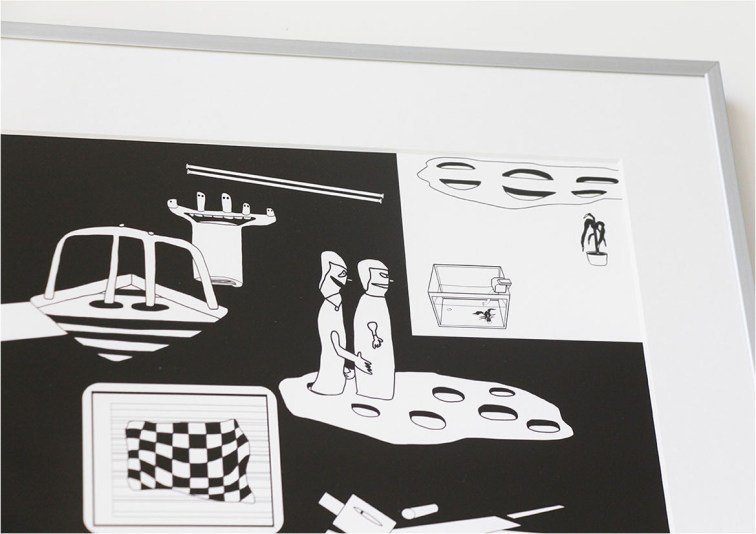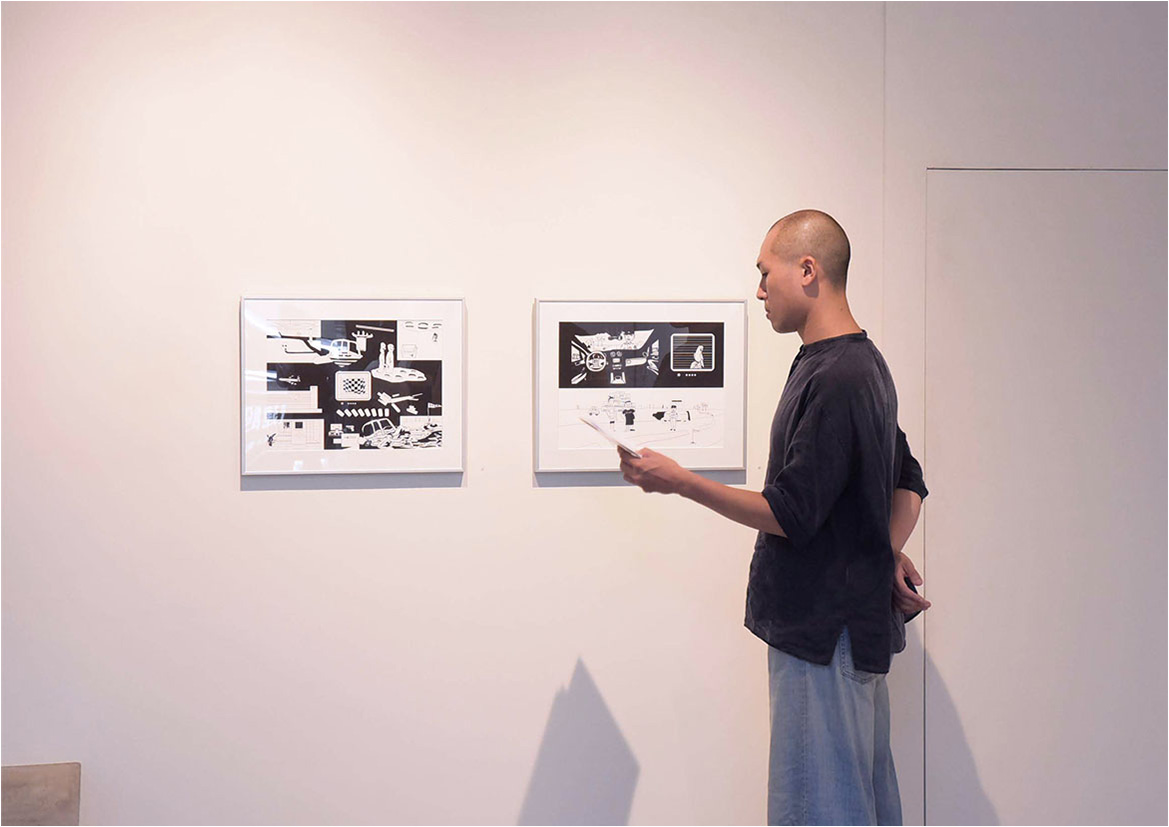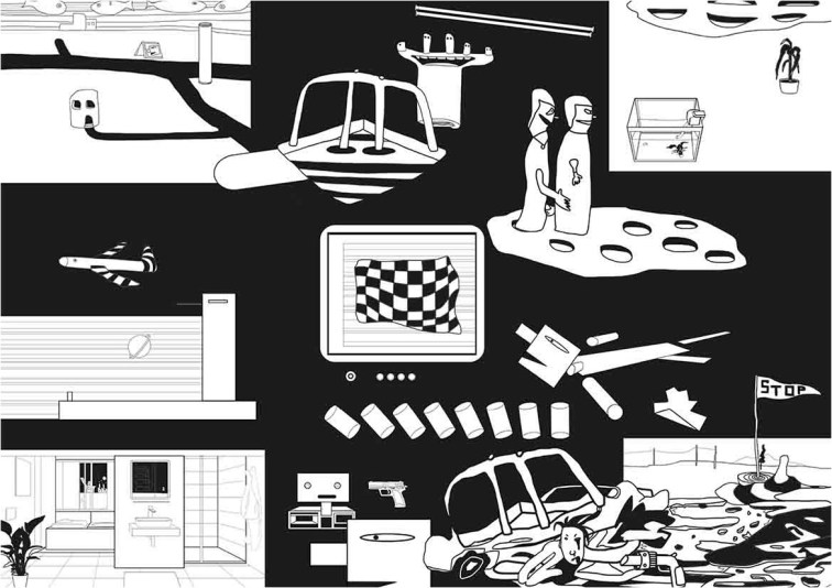 - 簡介|改編自「撞擊」。在這件平面作品中我選擇以場景作為出發,上方左側為從車內看出去的視角,一位面無表情的警察站在那裡執行勤務; 上方右側,是那隻後來在槍戰之中倖存的鸚鵡; 作品的下方,也是佔掉最多篇幅的部分,警察與兩個逃亡者面對面,在鳥不生蛋的地方生無可戀地遭遇彼此。在這張作品中,我完全用滑鼠畫出那些百無聊賴的軟爛線條,並無使用較硬的幾何之元素。當線條由手開始,接著再透過滑鼠畫出,最後自然而然地在數位介面中呈現出拙稚感。我並非一個善於描繪得好畫家,技藝並非精良,所以我很少回頭修改。我總是順著滑鼠的痕跡,在心裡告訴自己「就這樣畫下去吧!」。