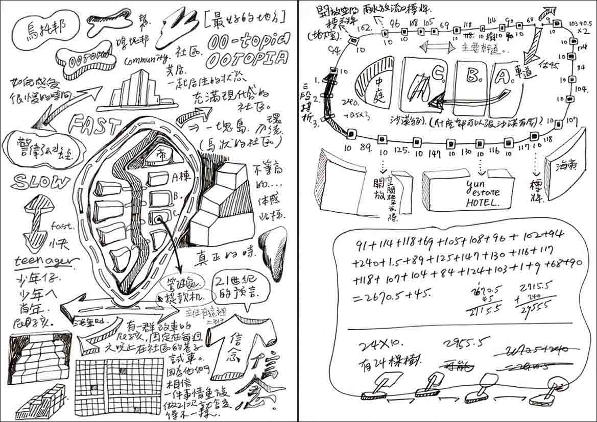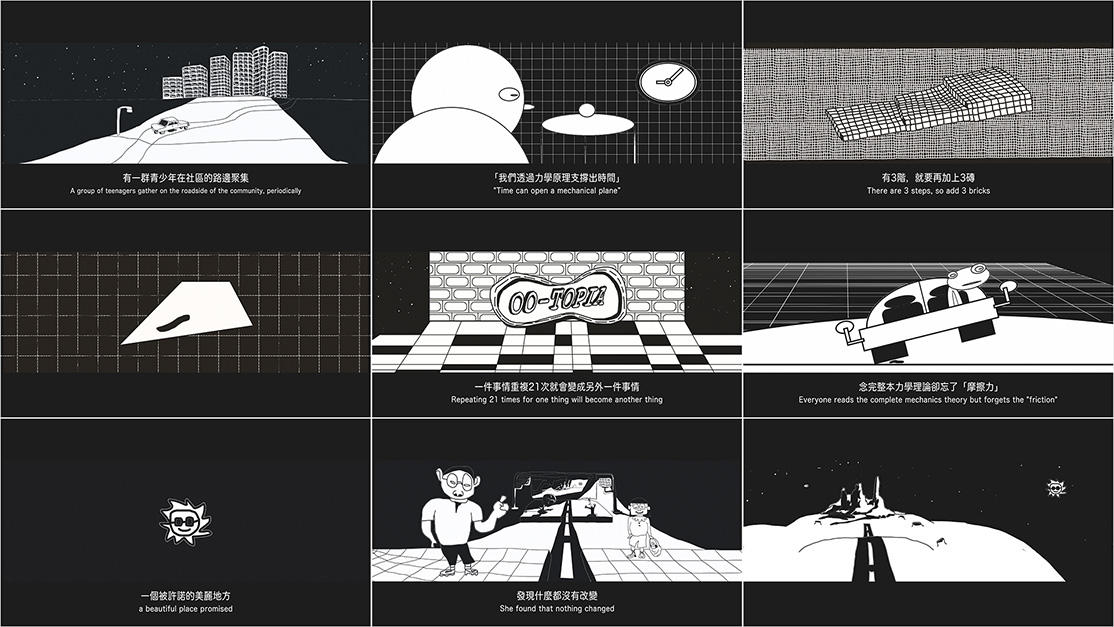 “OOtopia” is a deliberate miswriting of “utopia”, a word I have misappropriated and reforged. OOtopia reflects our distance from the world of the future; the misunderstandings caused by distance are the beginnings of imagination. The primary piece, Car-Modding Youth, the West, is like a nonsensical situation, depicting a group of youths who mod their cars and seem to be drawn to speed yet are always running in circles where they started. The other piece, Slug, Stairs, Security Guard, is instead like a situation from a scientific experiment: On the stairs, slug after slug is always moving forward, yet always stomped to death by passerby. Through the security guard’s “speed records”, they become interwoven with the car-modding youth. OOtopia is an assemblage of many unrelated elements: the crawling (slow) and the racing (fast); the local (Taiwanese) and Western (extraterrestrial); nonsense stories and rational mathematical calculations; the flow of time and unchanging forms – contradictory elements juxtaposed together. Through pondering that resembles experiments, the works attempt to bring some basis for trust to utter nonsense.