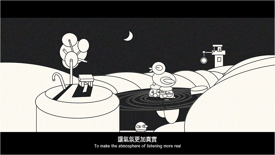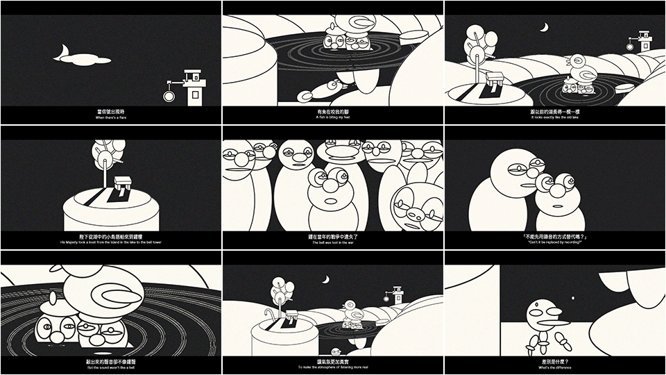 Caption|The story takes place around midnight. Two sailors, one more experienced than the other, are instructed to hide and wait on the lake. Their mission is to imitate the sounds of waterfowls when bells are sounded on land to please an old king, who finds bell ringing pleasing. As they wait, they start talking about the past of bells. In fact, bells no longer exist in the world of the video, as authentic bells were all gone due to wars. Consequently, people can only reproduce bells according to the definition of bells. However, the sounds of newly made bells are inevitably flawed. So, the palace staff decide to ask “the smartest person in the whole nation” to get them out of this embarrassing situation.