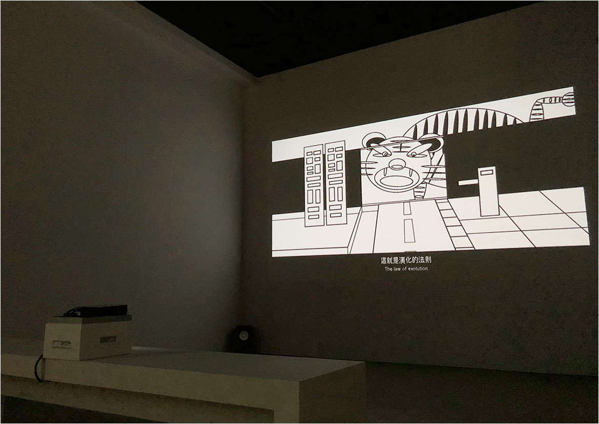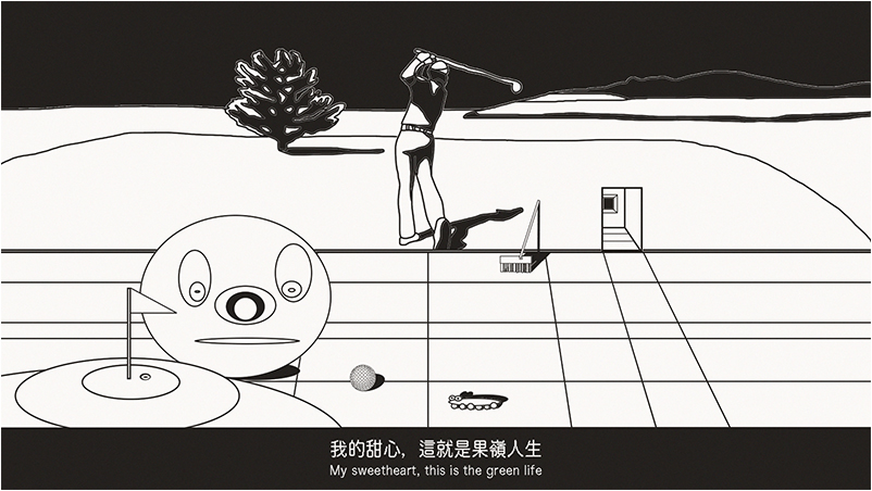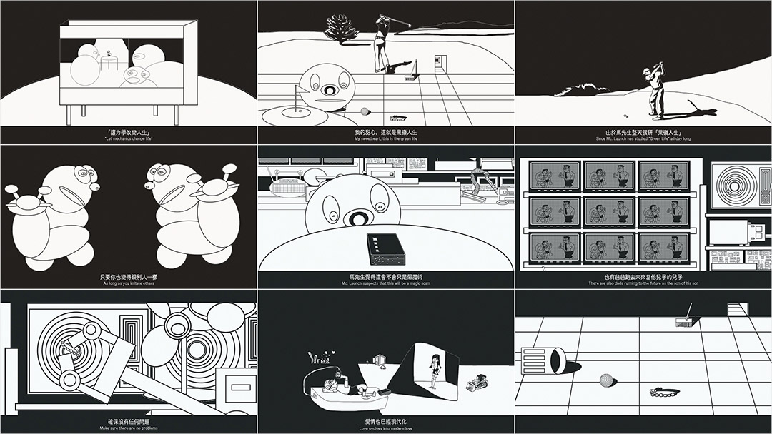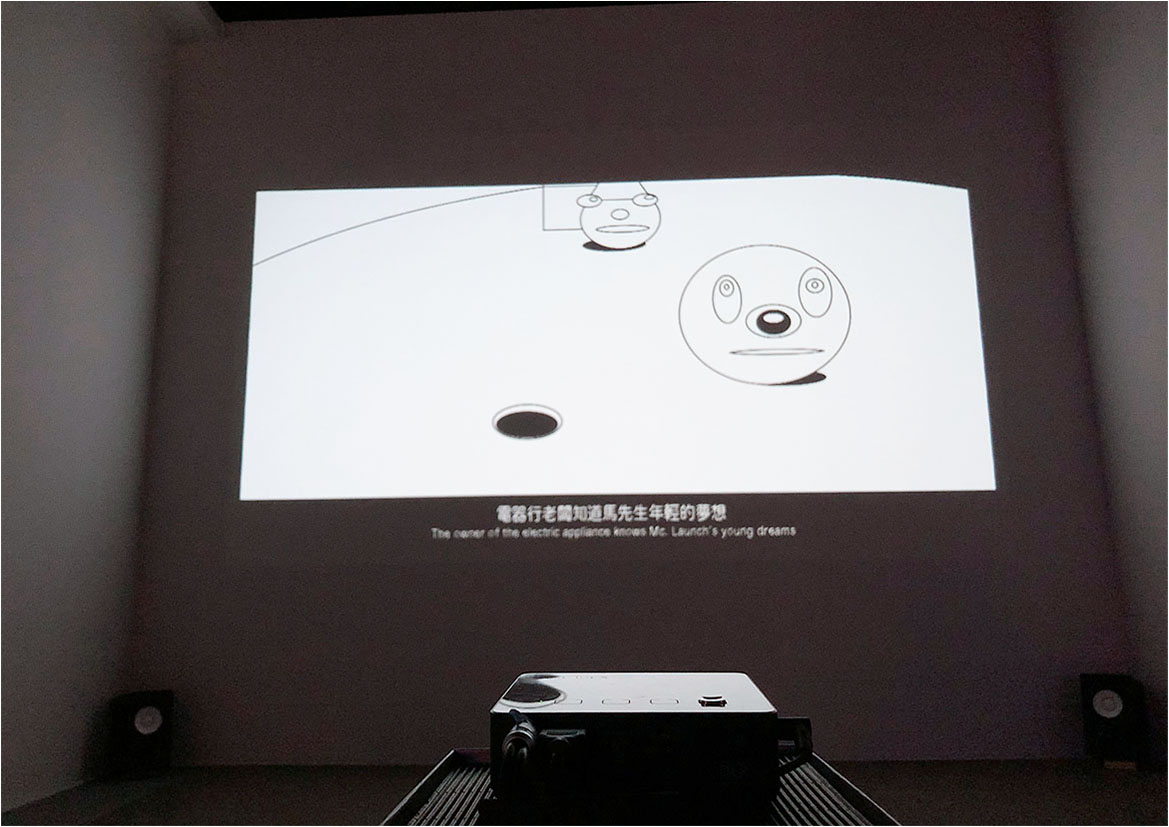 • Caption|I compiled this machine fable through a “machine-specific" approach, which modeled after a mini projector, to look into the psychological mechanisms of people’s expectation that machines can project their desire. The main character, Mc. Launch is a man who lives the daydream of “becoming a great golfer." A friend of his who owns an electrical appliance store is a descendant of Archimedes, the originator of mechanics.  Back in the day, Archimedes used the principle of force to help people, while today the store owner helps Mc. Launch to make his dream come true.  The store owner then recommended a projector endorsed by an expert in time and space, Doraemon.  However, the machine projects the fact of Mr. and Mrs. Mcs’ precious son, Little Pony’s future: His generation will become the “Beat Generation."  Mrs. Mc. is then outraged by the projection and breaks the machine asunder right away, yet Mc. Launch sees himself in the vision that he will become a great golfer in the broken machine. Whether it is a mediocre vision or a mind-blowing daydream, with my misuse of mechanics as a metaphor to weave my view of narrative and view of the machine, the story writes itself.